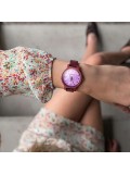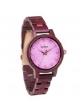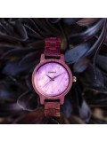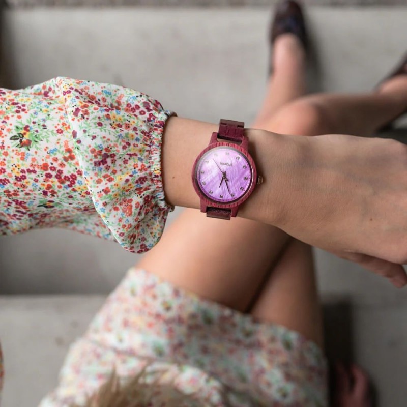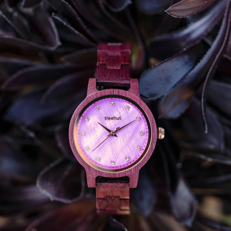 Emma Purple Heart Rose Gold, iridescent purple mother of pearl dial accented with white diamonds as numbers. Minimalist design framed gracefully in all natural purple heart wood case and band. All mother-of-pearl dials are unique pieces, full of mystery and surprises in different lights.
