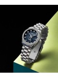 A jeweled bezel perfectly frames the obelisk-style hands and crystal markers.