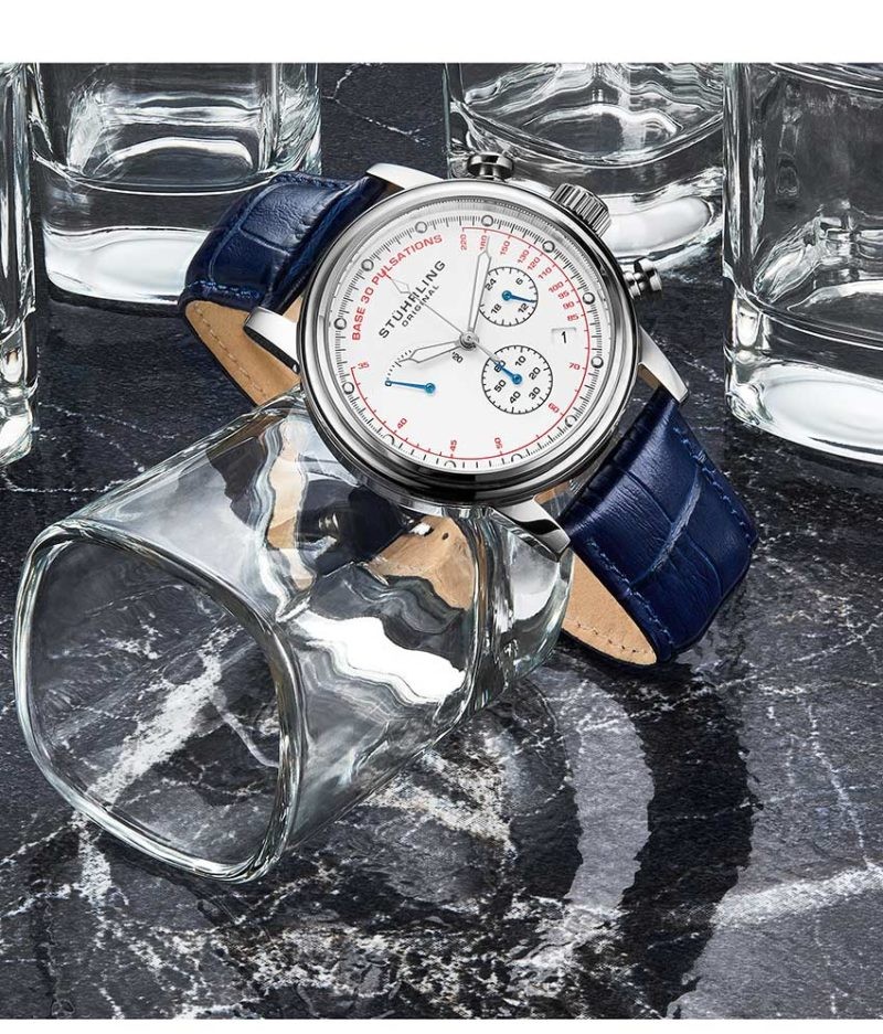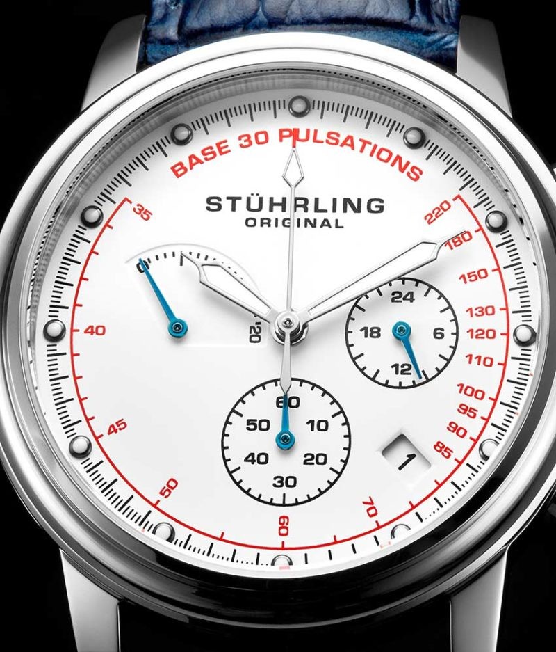 The pulsometer complication, with printed Base 30 Pulsations markers around the dial, brings uncommon functionality to your business wear.