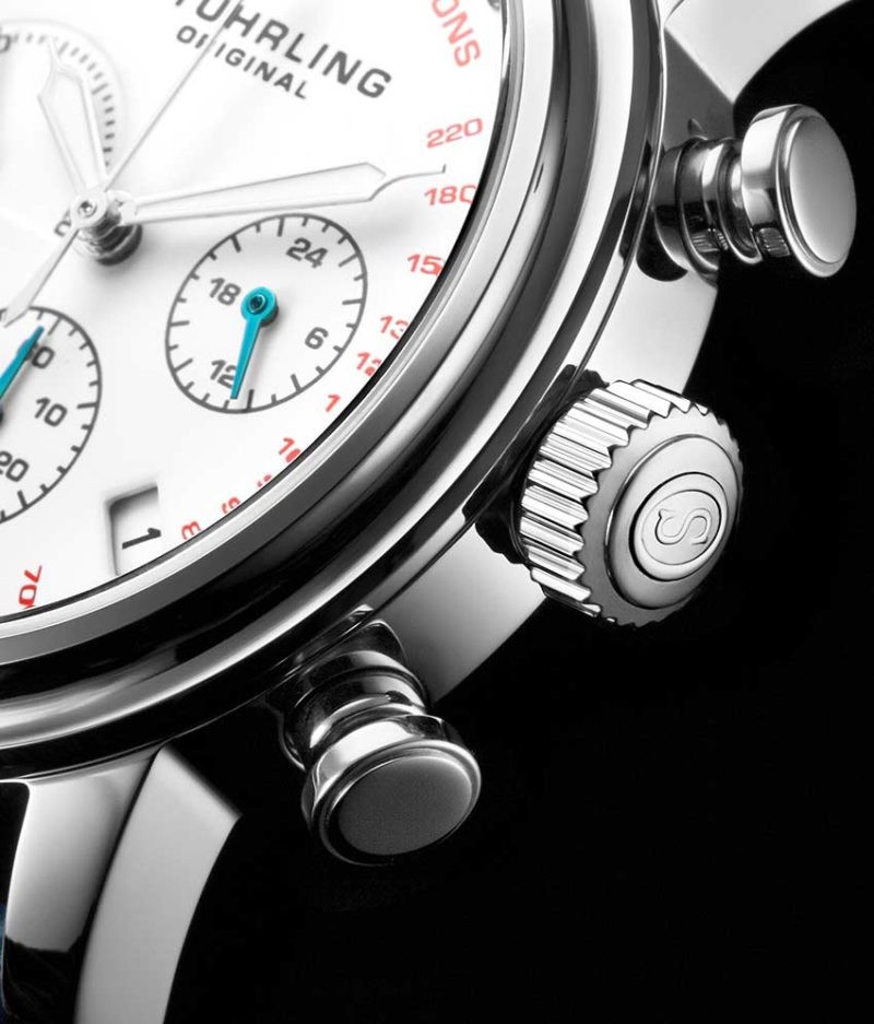 The polished bezel, pushers, and fluted crown are finished with an embossed leather strap, bringing an elegant presentation to a singular watch.