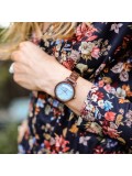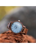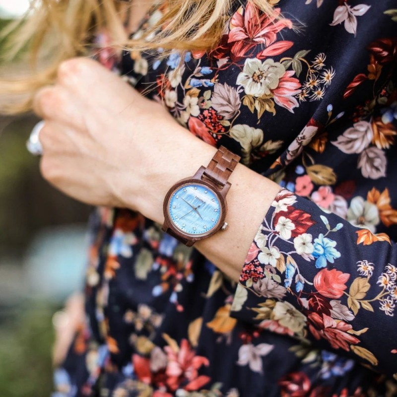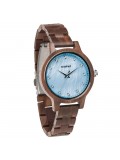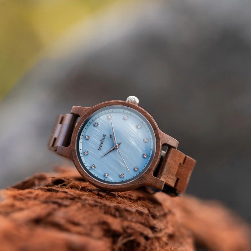 Emma Walnut Sky, iridescent gold-toned mother-of-pearl dial accented with white diamond numerals. Minimalist design framed gracefully in all natural rich chocolate walnut wood case and band. All mother-of-pearl dials are unique pieces, full of mystery and surprises in different lights.